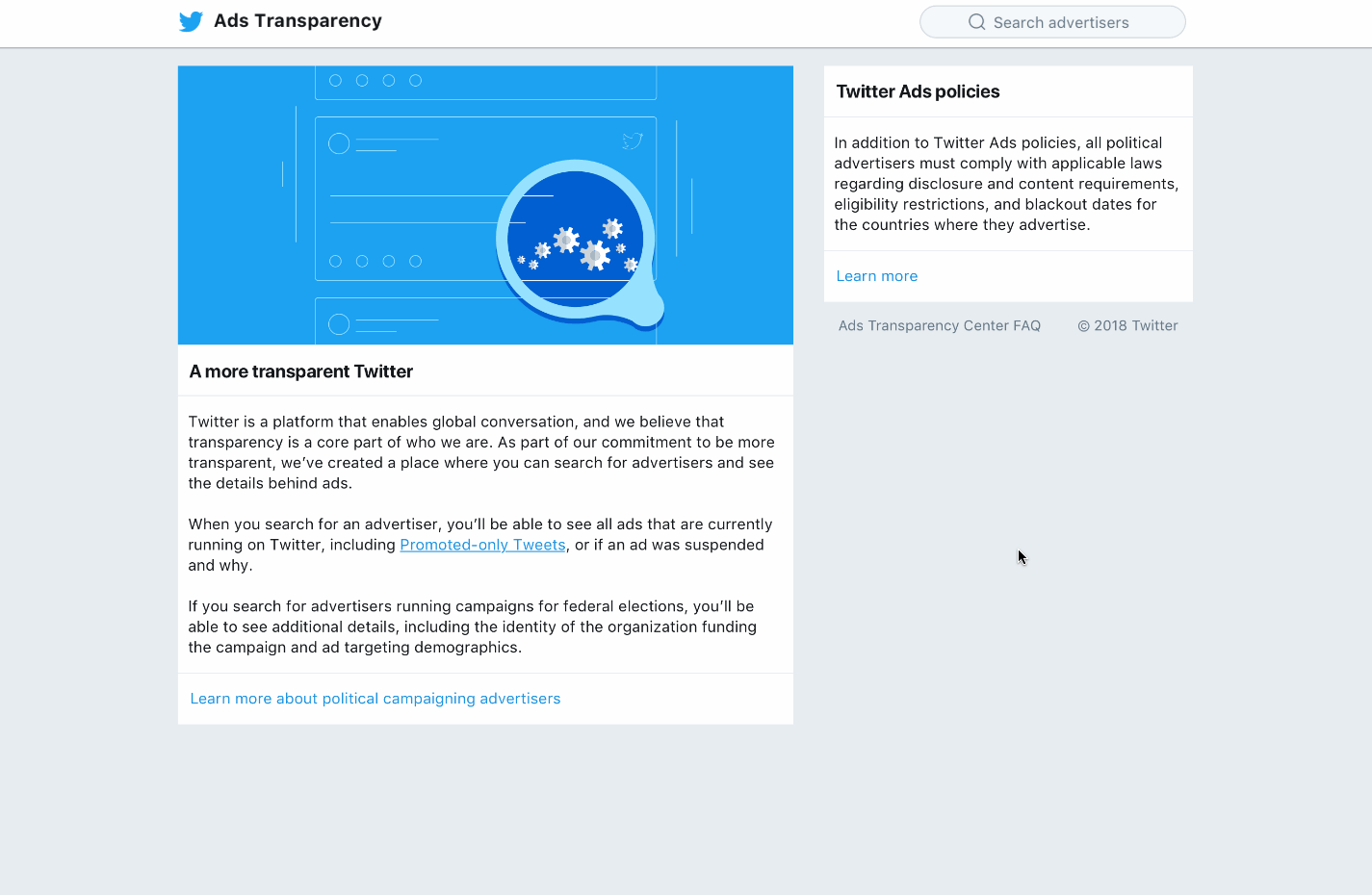 In June 2018, Twitter launched the Ads Transparency Center (ATC) in an effort to provide more transparency and confidence to users following the 2016 U.S. presidential election. In addition to ATC, which offers more promoted Tweet details particularly for political campaigns, Twitter started enforcing stricter policies for political advertisers.